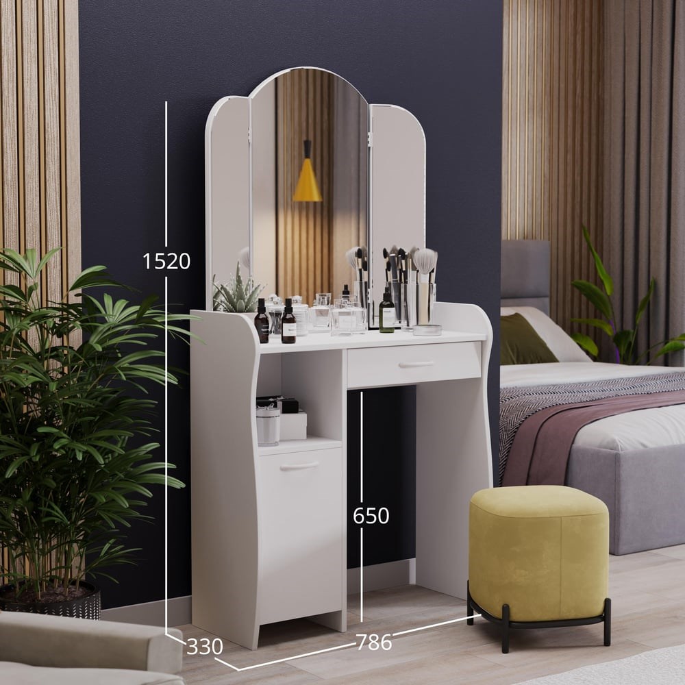 Туалетный стол украшением интерьера и практичным элементом в вашей квартире. Помимо внешней привлекательности стол имеет большое зеркало. Наличие открытой полки позволит установить предметы декора, а практичный выдвижной ящик добавит места для необходимых мелочей. В этом туалетном столике нет ничего лишнего, только самое необходимое для уголка женской красоты. Тип направляющих ящиков: роликовые Тип сборки: не универсальный
