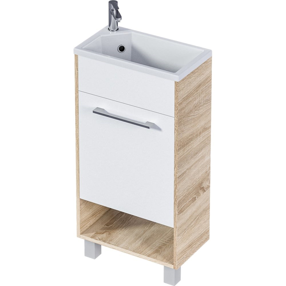 Тумба с раковиной в ванную 1Marka Lira 40 см Напольная/Подвесная цвет Дуб Сонома Левая У85922 - это компактная и функциональная мебель, которая станет отличным решением для гостевого санузла или маленькой ванной комнаты. Тумба выполнена в современном минималистичном стиле с правильными геометрическими формами и рациональностью, что позволяет ей гармонично вписаться в любой интерьер. Специально продуманная конструкция с компактной ручкой создает цельный легкий образ, не утяжеленный фурнитурой. Тумба оснащена демпферами и дверными петлями с доводчиками, обеспечивающими бесшумное и мягкое закрывание. Это обеспечивает бережливую повседневную эксплуатацию и продлевает срок службы мебели. В комплекте идет раковина из полимерной керамики, что делает решение еще более удобным и практичным. Тумба имеет следующие размеры: высота - 85 см, ширина - 39 см, глубина - 22 см. Материал корпуса - ЛДСП, материал фасада - МДФ. Покрытие корпуса влагостойкое, что обеспечивает дополнительную защиту от влаги. Тумба поставляется с ножками в комплекте, что облегчает ее установку. Выбирая тумбу для ванной Lira 40Н 1д. Дуб Сонома L, вы получаете стильную, функциональную и надежную мебель, которая прослужит вам долгие годы.