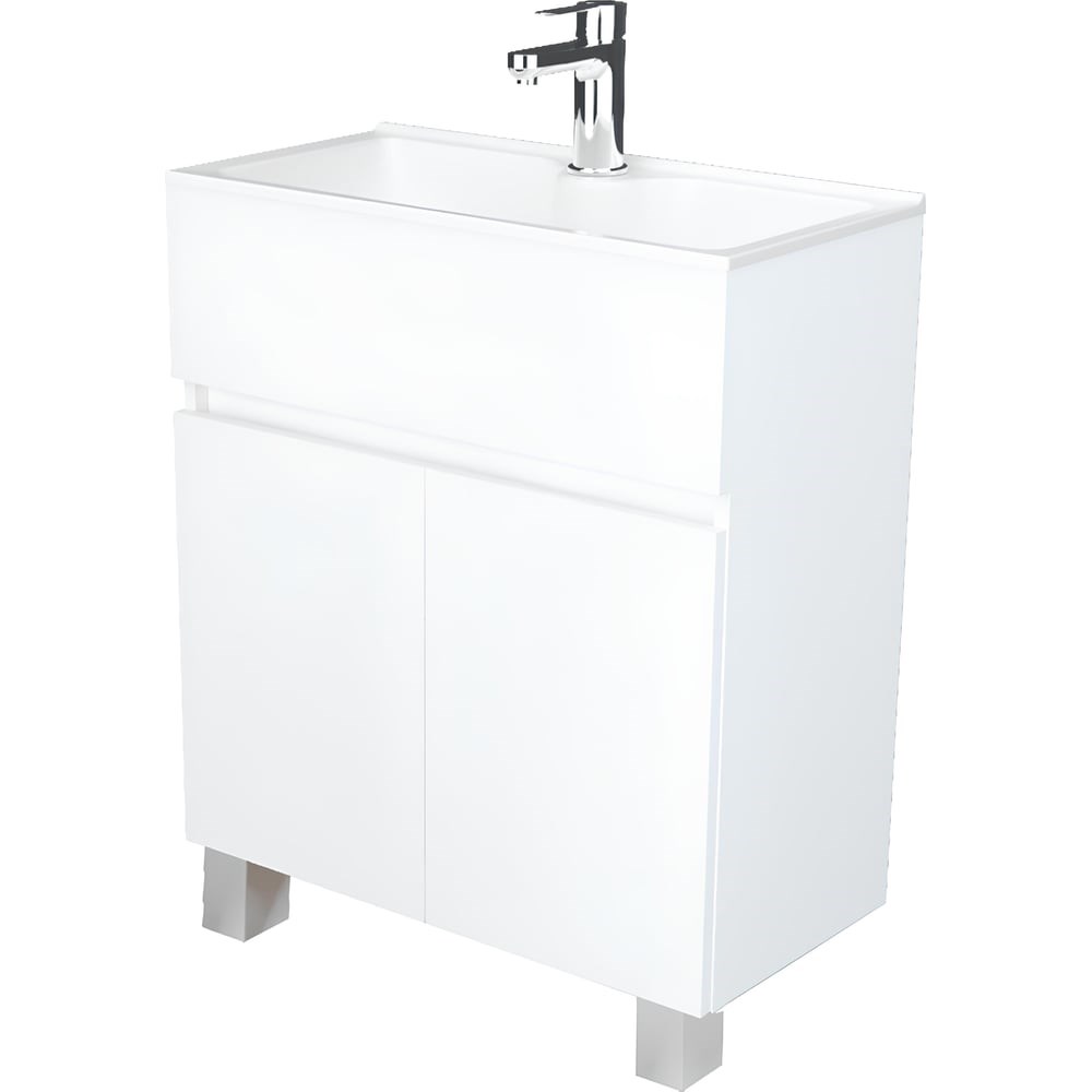 Напольная белая глянцевая тумба Mira с раковиной – универсальное решение для интерьера ванной комнаты. Минималистичный дизайн без классических ручек, белый глянцевый цвет тумбы придают легкость, свежесть интерьеру. • Материал фасада тумбы – МДФ, облицованная влагостойкой пленкой ПВХ, корпус из ЛДСП, покрытый водостойким составом. Благодаря этому тумба надолго сохранит первозданный вид в условиях повышенной влажности. • Раковина из уникального полимера Polytitan отличается прочностью, легкостью, неприхотливостью в уходе за счет непористой структуры полимера. Продуманная форма раковины предотвращает расплескивание воды. • Небольшая глубина модели экономит место в пространстве, не лишая комнату функциональности. • Полки различных размеров помогают удобно организовать хранение различных предметов – от бытовой химии до косметики. • Надежная фурнитура: рассчитана на 30 000+ открытий. Петли оснащены доводчиками, что обеспечивает мягкое закрывание дверей. • Модель идет в комплекте с раковиной, что упрощает монтаж и экономит время. Гарантия – 2 года. Напольная белая глянцевая тумба Mira с раковиной без ручек дополнит интерьер своей цельностью и легкостью. Будет радовать своих обладателей долгие годы.
