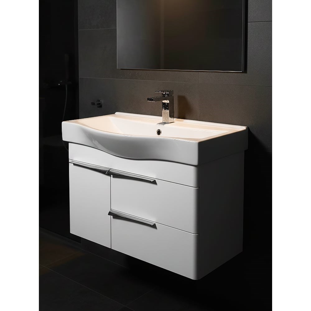 Тумба под раковину AQUATON «Беверли 80» — белый глянец (1A235501BV010)Коротко о главном Современный стиль и сияющий белый глянец — тумба станет выразительной деталью ванной комнаты. Надёжные материалы: влагостойкая ламинированная плита и высококачественная МДФ. Удобная внутренняя организация: слева распашная створка с нишей и регулируемой полкой, справа — два вместительных ящика. Комфорт в использовании: петли с доводчиками и интегрированная система плавного закрывания ящиков. Стильные ручки в глянцевом хроме гармонируют с белой керамической раковиной «Беверли» от Santek. Дизайн и материалы Тумба окрашена в белый цвет с высокой степенью глянца — это не только красиво, но и практично: поверхность устойчива к износу, легко очищается и долго сохраняет презентабельный вид. Комбинация ламинированной плиты и MDF обеспечивает влагостойкость и стабильность формы.Внутренняя организация и функциональность Левая секция: распашная створка, за ней — вместительная ниша с регулируемой полкой из влагостойкой ламинированной плиты. Это удобно для хранения банных принадлежностей и бытовой химии. Правая секция: два выдвижных ящика — идеальны для полотенец, косметики и мелочей. Ящики продуманы так, чтобы упорядочить всё самое необходимое. Петли с доводчиками и система плавного закрывания ящиков исключают шум и повышают комфорт при ежедневном использовании.