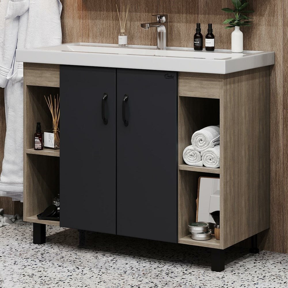 В тумбе Onika Тимбер 100 удачно сочетаются контрастные цвета и фактуры: серый матовый фасад с покрытием SoftTouch, корпус цвета дуба с роскошной текстурой, черная матовая металлическая фурнитура. Открытые полки по бокам от основного отделения обеспечивают быстрый доступ к часто используемым аксессуарам, а пространство за распашными дверцами с доводчиками по центру тумбы, станет удобным местом для хранения различных бытовых принадлежностей. Корпус тумбы выполнен из ЛДСП, фасад - из ЛМДФ в пленке, устойчивых к механическим воздействиям, перепадам температур и высокой влажности. 2 черных металлических ручки и 4 ножки (2 декоративных черных и 2 пластиковых) идут в комплекте с тумбой. Размеры тумбы без учета раковины и ножек: 97x45x68 cм.Размеры тумбы с учетом раковины и ножек: 101х45,5х83 см. Гарантия на изделие 2 года. Совместимая раковина - Kirovit Фостер 100
