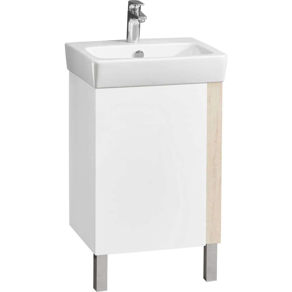 Тумба под раковину AQUATON «Кантри 50» — белый глянец / дуб Верона (1A257801AHB20)Представляю компактную и аккуратную тумбу «Кантри 50» — идеальное решение для небольшой ванной, где важны свет, порядок и простота ухода. Сдержанный белый глянец в сочетании с тёплой древесной текстурой дуба Верона создают спокойную и уютную атмосферу.Коротко о главномСовременный лаконичный дизайн: белый глянец фасада + древесный акцент дуб Верона.Все элементы выполнены из влагостойкой ламинированной ДСП — рассчитаны на условия ванной комнаты.Одна распашная створка, за ней — полочка (регулируемая).Торец фасада обработан под углом — открытие производится за створку, без выступающих ручек.В комплекте — регулируемые опоры для удобной установки.Дизайн и материалыБелый глянец визуально расширяет пространство и придаёт чистоту интерьеру, а ламинированная ДСП в цвете дуб Верона добавляет натуральный, тёплый акцент. Материал влагостойкий и простой в уходе: достаточно мягкой влажной салфетки и деликатного моющего средства, чтобы тумба долго выглядела как новая.Функциональность и удобствоРаспашная створка открывает доступ к аккуратной нише с полкой — храните косметику, бытовую химию и запасные полотенца.Регулируемая полка позволяет адаптировать внутреннее пространство под ваши потребности.Обработанный торец фасада обеспечивает эргономичное открытие без ручек, сохраняя чистые линии фасада.Регулируемые опоры помогут выровнять мебель даже на неровном полу и защитят корпус от прямого контакта с покрытием.