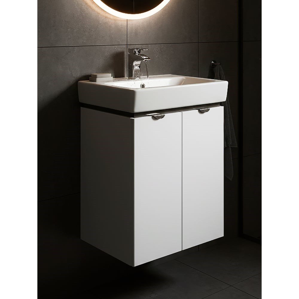 Тумба под раковину Акватон Скай PRO 55 белый глянец 1A238101SY010 в современном стиле гармонично сочетает ультрабелые глянцевые фасады с декоративной вставкой в цвете серый кашемир - элегантное и практичное решение для удобной организации пространства в небольших ванных комнатах. Корпус модели из влагостойкой ЛДСП и фасады из высококачественной МДФ покрыты белой полиэфирной краской ультрафиолетового отверждения, которая гарантирует безупречный внешний вид, а также прочность и долговечность. За распашными фасадами-створками находится регулируемая по высоте полка, таким образом внутри достаточно места, чтобы разместить всё необходимое. Петли с доводчиком обеспечивают плавное и бесшумное закрывание. Белоснежные глянцевые фасады подчеркивают эргономичные хромированные ручки. Идеальный комплект с тумбой составит раковина Нео от бренда Santek (приобретается отдельно).