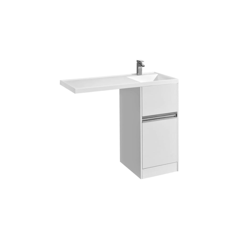 Материал корпуса: влагостойкий ЛДСП. Верхний ящик открывается с помощью системы push-to-open, нижний - за профильную хромированную ручку. Максимальная нагрузка ящика 25 кг. Регулируемые опоры. Ориентация: правая. Совместима с раковиной Акватон Лондри 105.