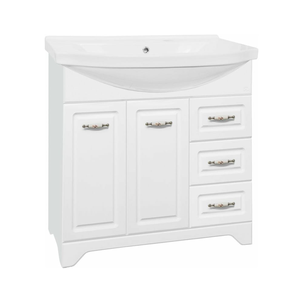 Тумба Style Line Олеандр-2 90 (3 ящ.) под умывальник Эльбрус 90, Люкс белая ЛС-00000241 классического дизайна, декорированная ручками с керамическими вставками под бронзу с изящным рисунком. Направляющие полного выдвижения Hettich. Сборка изделия с помощью эксцентриковых стяжек Hafele. Все материалы полностью влагостойкие. Данная тумба предусматривает открытую подводку воды.
