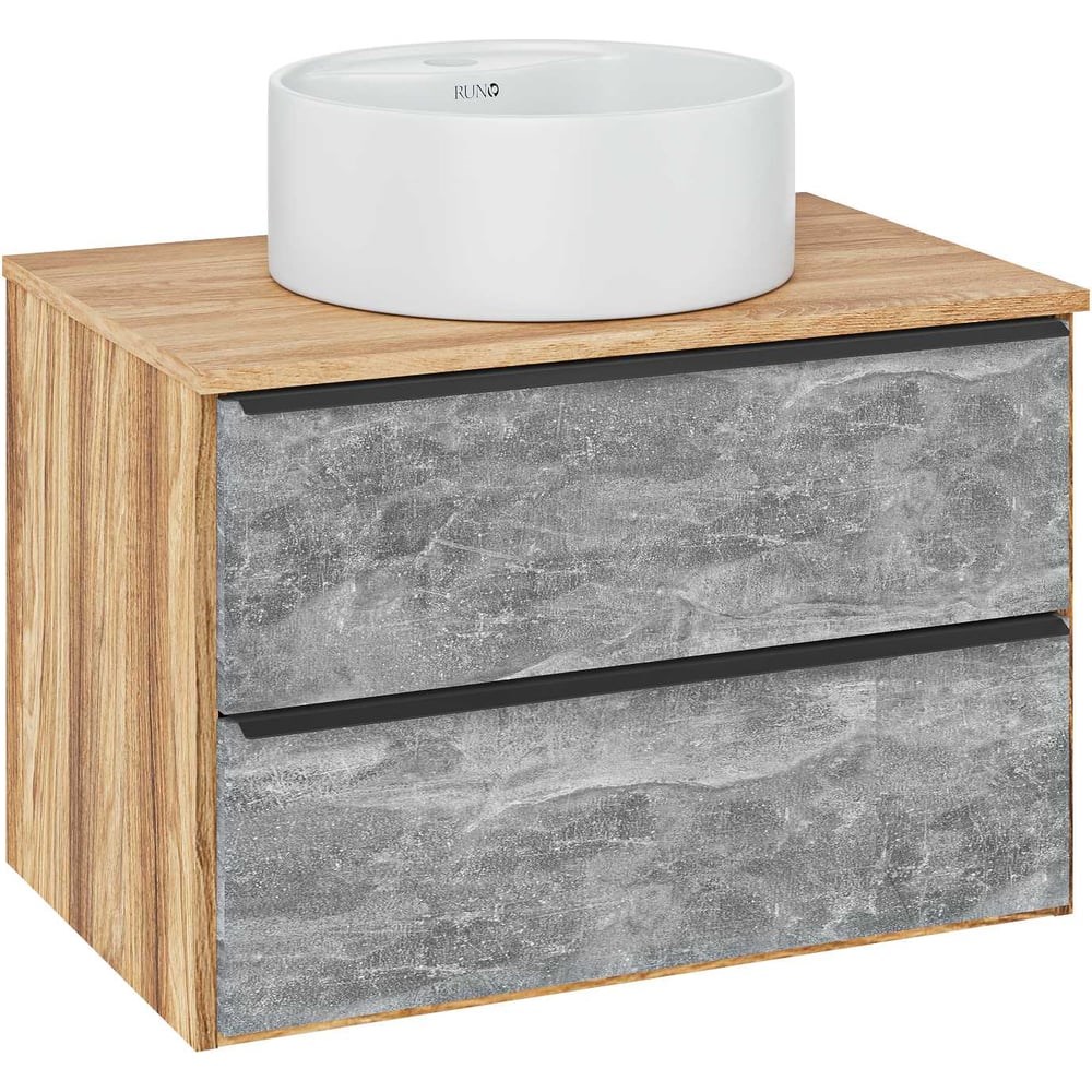 Тумба под раковину Мальта - дизайнерское решение для оформления ванной комнаты. Тумба под раковину Мальта (подвесная) - это стильное сочетание древесной и серой текстуры дуба. Тумба в ванную имеет два выдвижных ящика на шариковых направляющих, оснащенных системой плавного закрывания. В комплекте идут: две металлических ручки, навесы для крепления к стене. К тумбе для ванной комнаты подходят любые накладные керамические раковины бренда RUNO. Мебель для ванной RUNO - красота и практичность в мелочах!