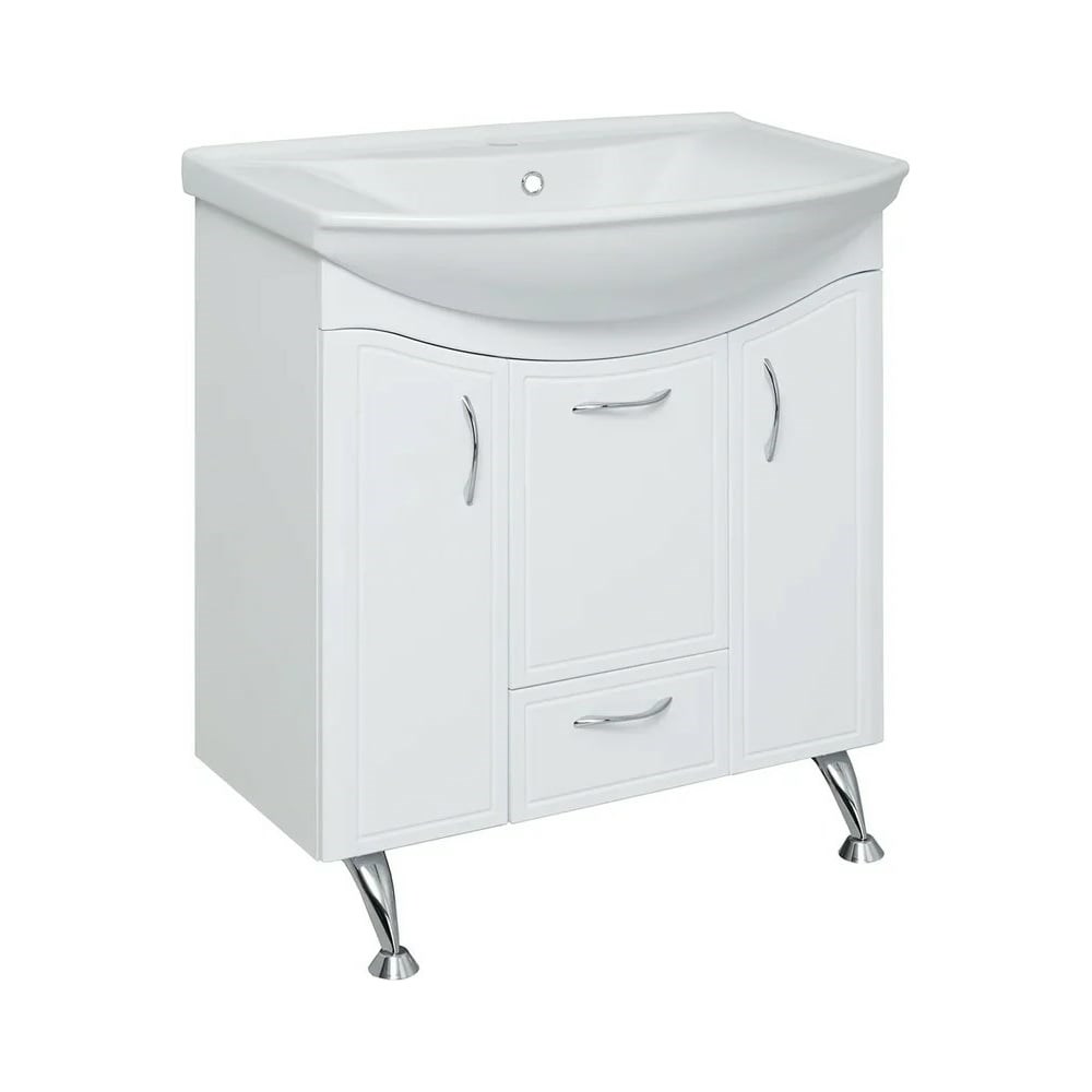 Внимание! Раковина приобретается отдельно. Арт. - RUNO Умывальник мебельный Kirovit Стиль 85 УТ000001523 Тумба RUNO СЕВИЛЬЯ 85 под умывальник Стиль 85 00000000597 - безупречная классика в современном исполнении в оформлении ванной комнаты. Тумба под раковину СЕВИЛЬЯ (напольная) - выполнена в традиционном и всегда модном белом цвете и гармонично впишется в любой интерьер ванной комнаты. Тумба в ванную имеет две распашные дверцы, одну откидную дверцу и нижний выдвижной ящик на шариковых направляющих. В комплекте к тумбе идут 4 ручки, петли со встроенным доводчиком, 2 хромированные и 2 пластиковые ножки. Мебель для ванной RUNO - красота и практичность в мелочах!