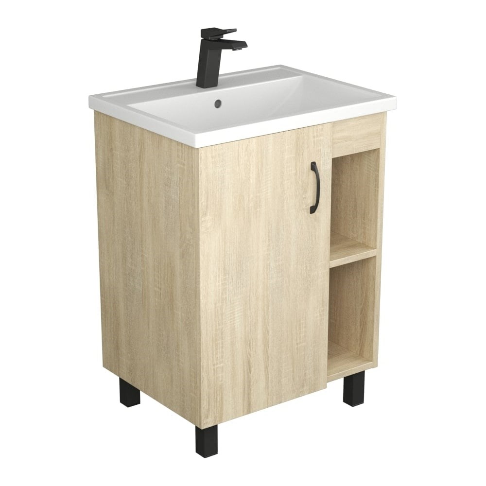 Тумба UNCORIA Дора 60 под умывальник Фостер 60 см, Дуб Сонома 56060 дополнительные характеристики: Напольная тумба Дора 60см, цвет дуб сонома Изготовлена из ВЛДСП 16мм Две открытые ниши Дверка с ручкой, цвет черный матовый Опоры 4шт. цвет черный матовый