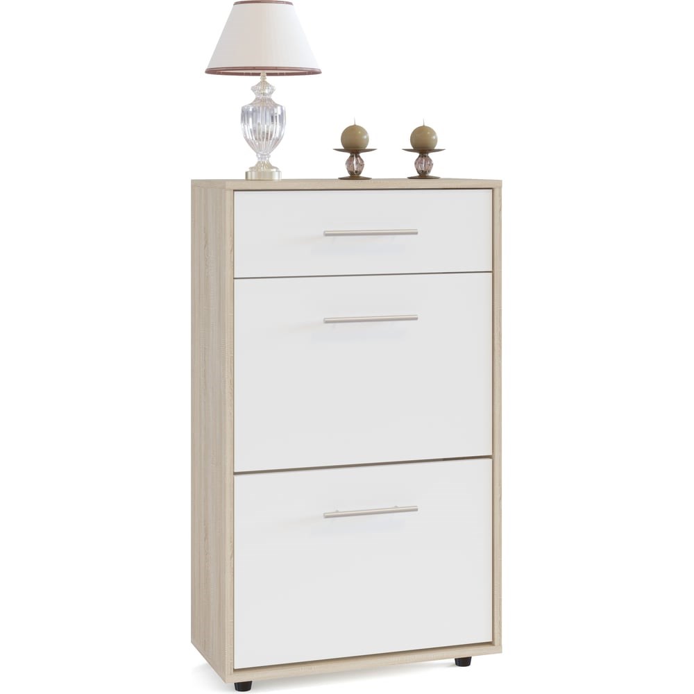 Тумба СОКОЛ дуб сонома/белый ТП-2 ШОТП2Сб. Верхний выдвижной ящик вместит всё, что нужно взять с собой, выходя из дома. Средняя дверь оснащена откидывающимся механизмом со специальными полками для размещения обуви, который обеспечивает удобство хранения и легкий доступ к необходимой паре кроссовок или туфель. За нижней дверью также располагается отсек для хранения обуви. Изделие поставляется в разобранном виде. Хорошо упаковано в гофротару вместе с необходимой фурнитурой для сборки и подробной инструкцией. Изготовлена из высококачественной ЛДСП 16 мм. Отделывается кромкой ПВХ 0.4 мм. Высота ножек: 46 мм. Механизм открывания средней дверцы — газлифт, нижняя дверца на магните. Тип направляющих: шариковые полного выдвижения.