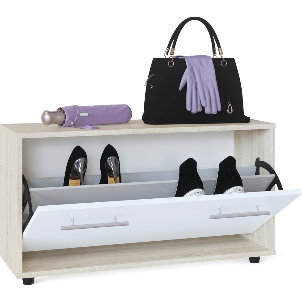 Тумба СОКОЛ дуб сонома/белый ТП-3 ШОТП3Сб. Дверь оснащена откидывающимся механизмом со специальными полками для размещения обуви, который обеспечивает удобство хранения и легкий доступ к необходимой паре кроссовок или туфель. Тумбу в закрытом состоянии можно использовать в качестве места для сидения, оно выдерживает нагрузку до 100 кг.
