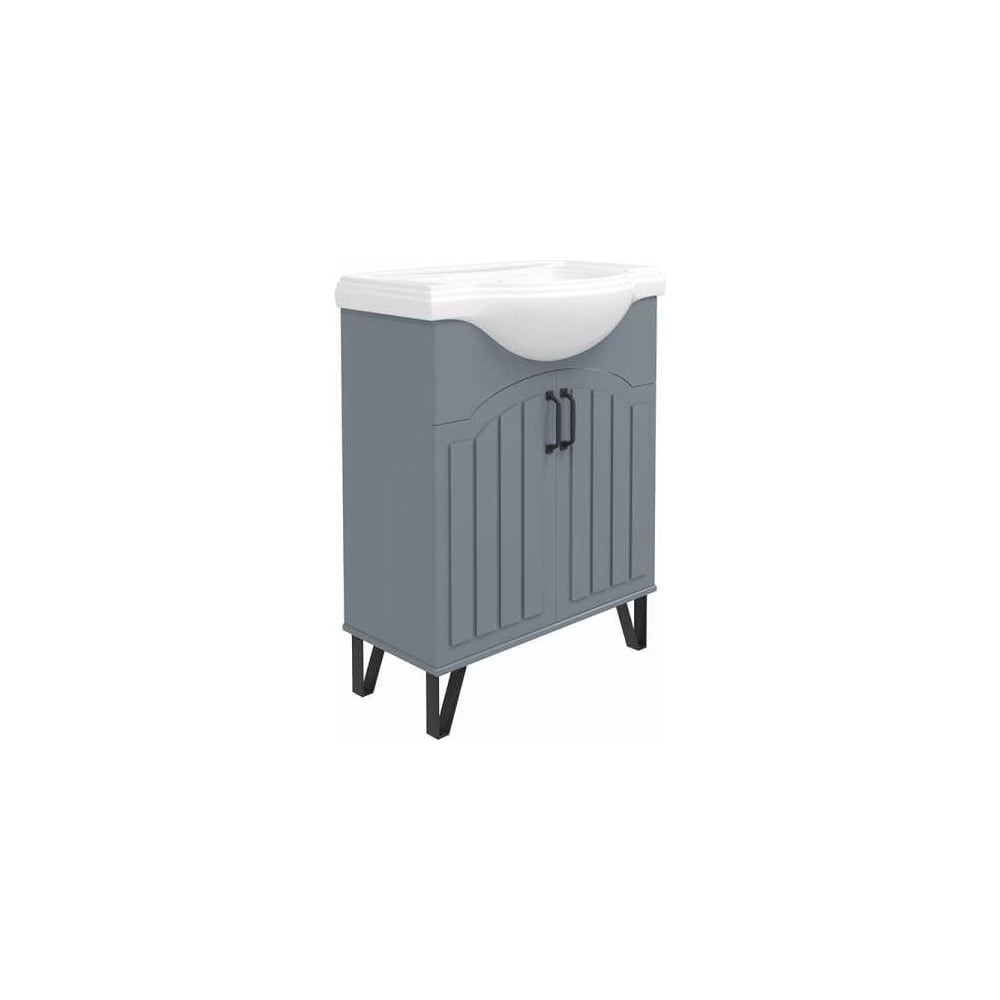 Тумба Teymi - это влагостойкая мебель для ванной изготовленная из качественных древесных материалов, ламинированного МДФ покрытого глянцевой эмалью. Изделие выполнено в матовом графитовом цвете, имеет эргономичные ручки и идеальную фрезеровку фасадов. Тумба закрывается на две распашные дверцы с доводчиками и имеет два просторных отделения для хранения. Матовый фасад красиво контрастирует с черными вертикальными ручками, украшающими дверцы, и оригинальными изящными ножками. К напольной тумбочке подходит красивая полукруглая раковина Kirovit Классик 65, в белом цвете - приобретается отдельно.