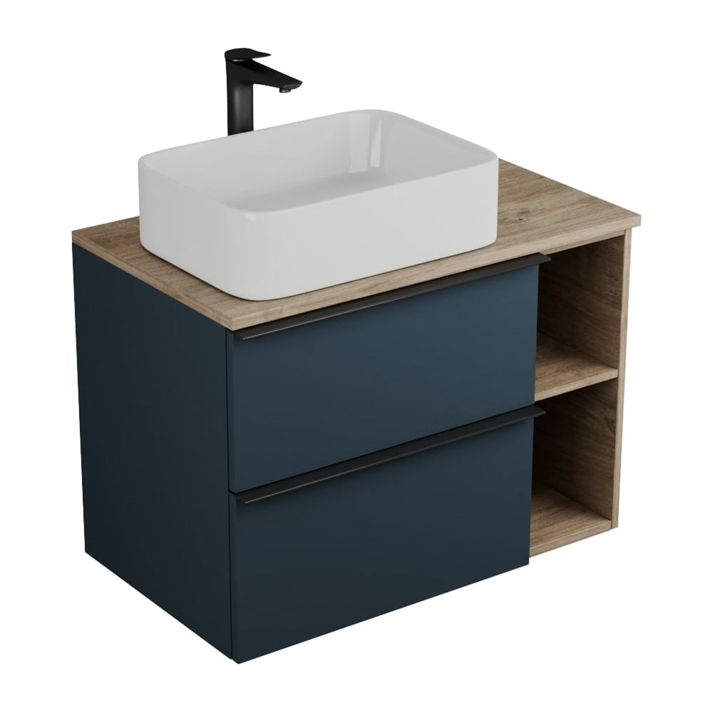 Тумба Sangro 80см (58027); корпус ВЛДСП-покрытие ПВХ; фасад МДФ 19мм-покрытие ПВХ; цвет индиго бархат; столешница МДФ 19мм-покртиые ПВХ; цвет дуб харбо; верхний ящик с системой разделения; 2 выдвижных ящика со встроенным доводчиком плавного закрывания, скрытого монтажа; две ниши; внутренняя отделка цвет дуб харбо; раковина в комплект не входит; отдельно можно приобрести накладную раковину