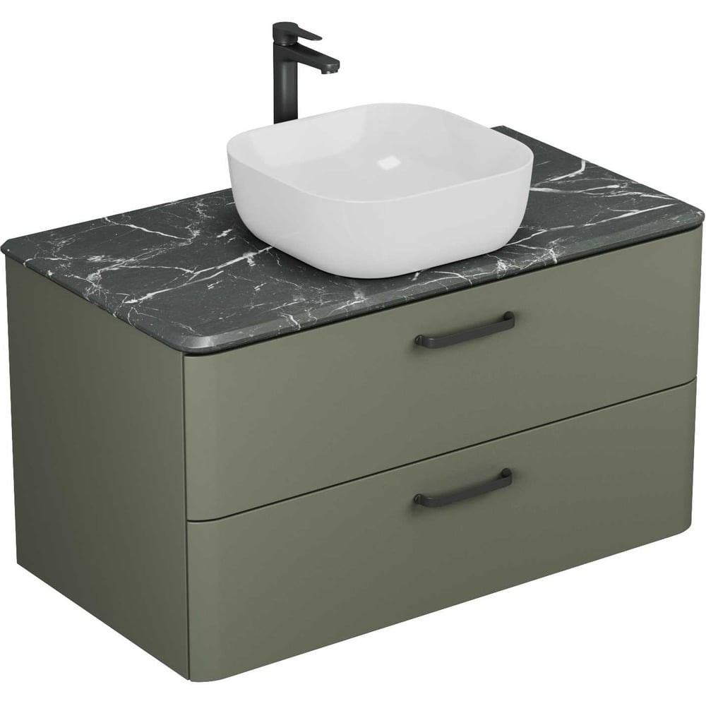 Тумба Tibr 100см со столешницей (510019); корпус ЛДСП 16мм; фасад МДФ 19мм; покрытие краска, цвет олива матовый; верхний ящик с системой разделения; 2 выдвижных ящика плавного закрывания, скрытого монтажа; внутренняя отделка цвет дуб зебрано; дополнительно можно приобрести ножки; раковина в комплект не входит.