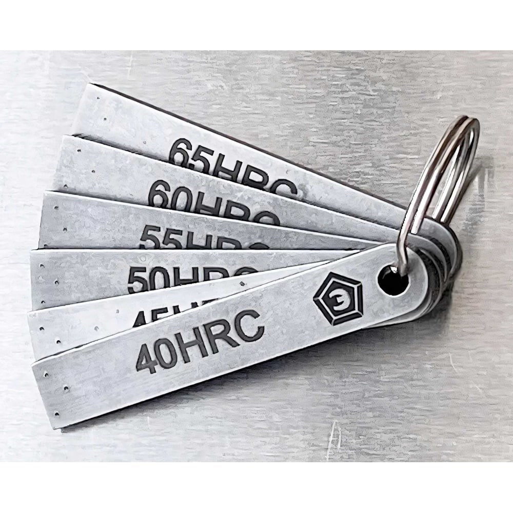 Царапающий твердомер ТП-6 – суровый и безотказный инструмент для приблизительной оценки твердости металла по шкале Роквелла в диапазоне от 40 до 65 HRC (примерно 392-865 единиц по Виккерсу). Выполненный в виде тарированных пластин, разрушающий твердомер ТП-6 дает возможность контроля труднодоступных мест, поверхностных слоёв и неподготовленных поверхностей. Тарированные пластины полезны для приемки по критерию прошел/не прошел или когда необходимо определить твердость изделий со сложной геометрией, например на внутренних полостях труб, краях изделий, зубьях шестерен, фрез и пил. При имеющихся преимуществах, твердомер ТП-6 является грубым оценочным инструментом, а не средством измерения, поэтому не подлежит поверке, но может быть откалиброван по заявке заказчика. При переводе полученных значений HRC в другие шкалы твердости, будет возникать дополнительная погрешность, которую необходимо учитывать. Восстановление пластин с изношенной рабочей частью могут быть восстановлены только заточкой с охлаждением.