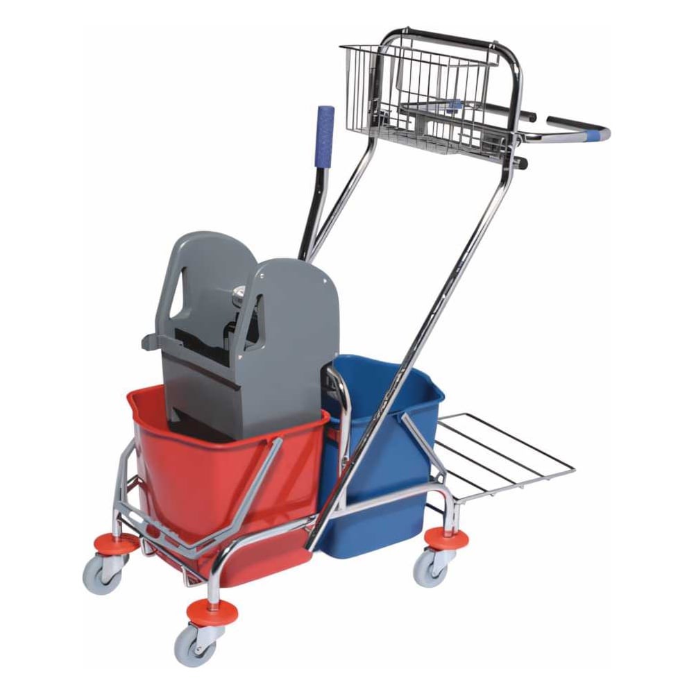 Уборочная тележка BRABIX предназначена для уборки в офисах или на производствах большой площади. В комплекте два ведра по 15 литров, механический отжим, корзинка для химии и вспомогательного хозинвентаря, держатель для мешка с нижней платформой. Представляет собой металлический каркас с установленным на него механическим отжимом для веревочных и плоских МОПов (плоские МОПы для удобства лучше использовать с УШАМИ (в наименовании У (УШИ) или У/К (УШИ / КАРМАНЫ), двумя съемными ведрами по 15 литров, корзиной для бытовой химии, держателем для мешка и металлическим поддоном. База изготовлена из качественного металла, а инвентарь (ведра и отжим) из пластика. Колеса позволяют перемещаться в произвольном направлении. Имеются защитные колпачки на колесах.