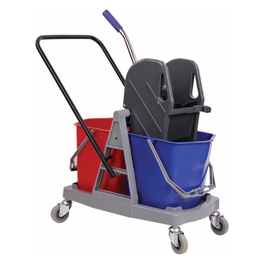 Уборочная тележка BRABIX предназначена для проведения влажной уборки в офисных и производственных помещениях с большой площадью. Представляет собой пластиковый каркас с установленными на него механическим отжимом для петельных тряпок и МОПов и 2 съемными ведрами по 17 л (рекомендованный объем каждого ведра - 15 л). База и инвентарь изготовлена из качественного пластика. Тележка выполнена в трехцветном исполнении: красный, синий и серый. Колеса позволяют перемещаться в произвольном направлении. Габариты - 93х43х71 см. Вес - 8 кг.