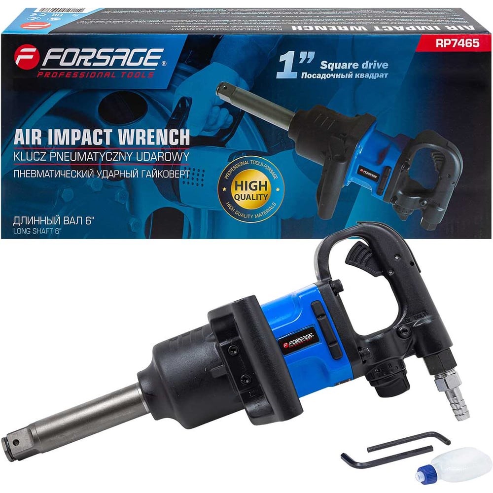 Эта модель пневматического ударного гайковерта Forsage с длинным валом разработана для выполнения широкого спектра задач в автомобильных сервисах, производственных цехах и ремонтных мастерских. Благодаря удлиненному шпинделю, инструмент позволяет работать с резьбовыми соединениями, расположенными в труднодоступных местах, что делает его незаменимым помощником в сложных условиях.Основные характеристикиМаксимальный крутящий момент: до 2000 Нм, что позволяет легко откручивать и закручивать гайки, даже в глубоких стальных ободах грузовых колес.Частота вращения рабочего вала: до 6000 об./мин при давлении сжатого воздуха более 6,3 бар.Вес: 8,4 кг, что обеспечивает баланс между мощностью и управляемостью.Расход сжатого воздуха: до 320 литров в минуту, что требует наличия качественного компрессора.Удобство работыГайковерт комплектуется дополнительной ручкой для удобства в работе, быстросъемным соединителем для легкого подключения, масленкой для поддержания инструмента в рабочем состоянии и регулировочным ключом для настройки параметров работы. Длина вала составляет 154 мм, что позволяет достигать даже самых удаленных резьбовых соединений.ЗаключениеПрямой пневматический ударный гайковерт с длинным валом — это мощный и функциональный инструмент, который значительно упрощает выполнение сложных задач. Его высокая производительность и возможность работы в ограниченных пространствах делают его отличным выбором для профессионалов в области автосервиса и производства!
