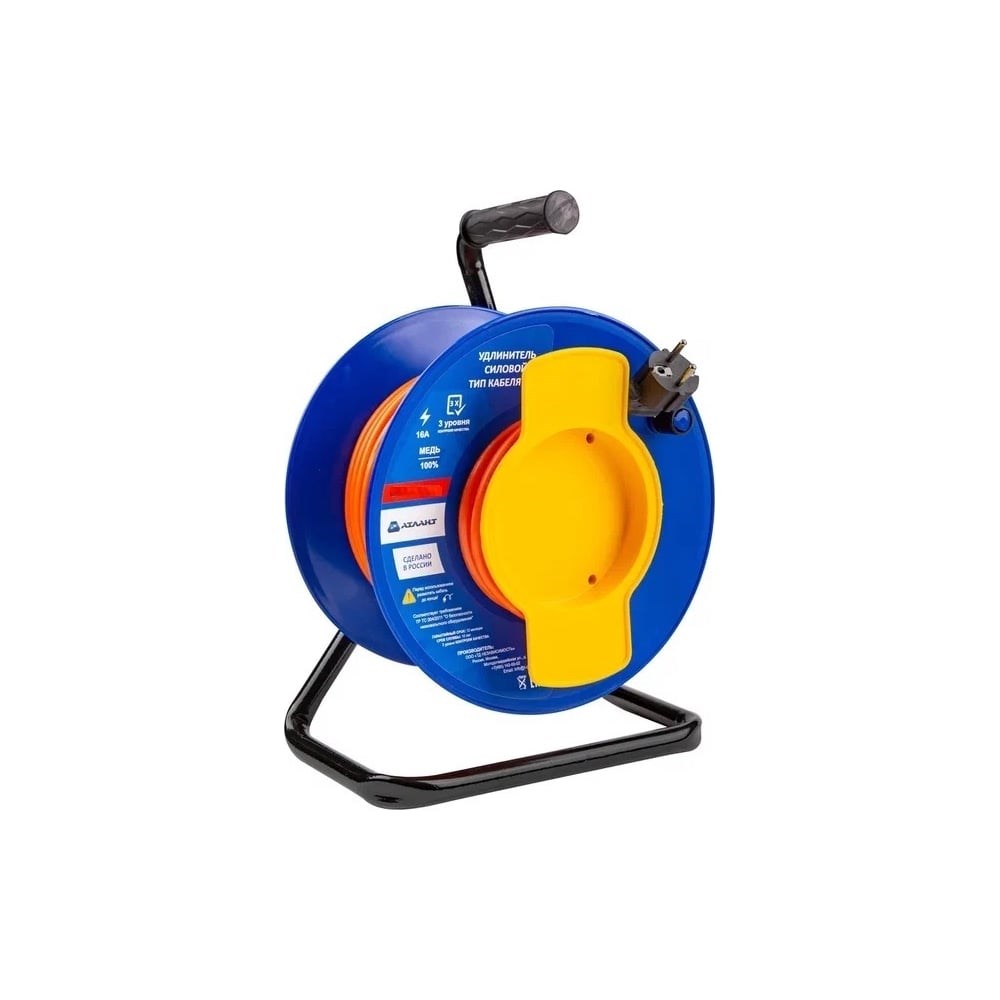 Силовой удлинитель “Атлант” 40м без заземления станет верным помощником как садоводам для работы на даче, так и рабочим для строительных работ, обеспечивая стабильное электропитание и удобство в работе. С его помощью Вы сможете расширить доступ к электропитанию и создать рабочую зону где угодно, попутно увеличивая и радиус действия электрооборудования. Преимущества: 1 евро розетка, подходит для питания мощных строительных инструментов, газонокосилок, электроопилы, триммеров и любых других устройств; Нагрузка 2200 Вт. Даёт возможность подключить электроинструменты, обеспечивая безопасное и надежное электропитание; Степень защиты IP54. Предотвращает попадание крупных объектов, розетка предназначена для работы во влажных условиях; 40 метров позволяет подключать электроприборы на больших расстояниях; Вращающийся барабан из ударопрочного пластика предотвращает запутывание кабеля и обеспечивает более аккуратное хранение удлинителя после использования; Удобная ручка для смотки катушки позволяет быстро наматывать или разматывать кабель; Прорезиненная эргономичная ручка. Гарантирует надежный захват и удобный перенос; Литая вилка. Обеспечивает прочное и надежное соединение с источником электропитания, исключая риск разъединения, повреждения контактов, перегрева или короткого замыкания; Надежная стальная рама. Гарантирует устойчивость как на ровной асфальтовой поверхности, так и на рыхлой земле. Внимание! Перед использованием размотайте кабель до конца!