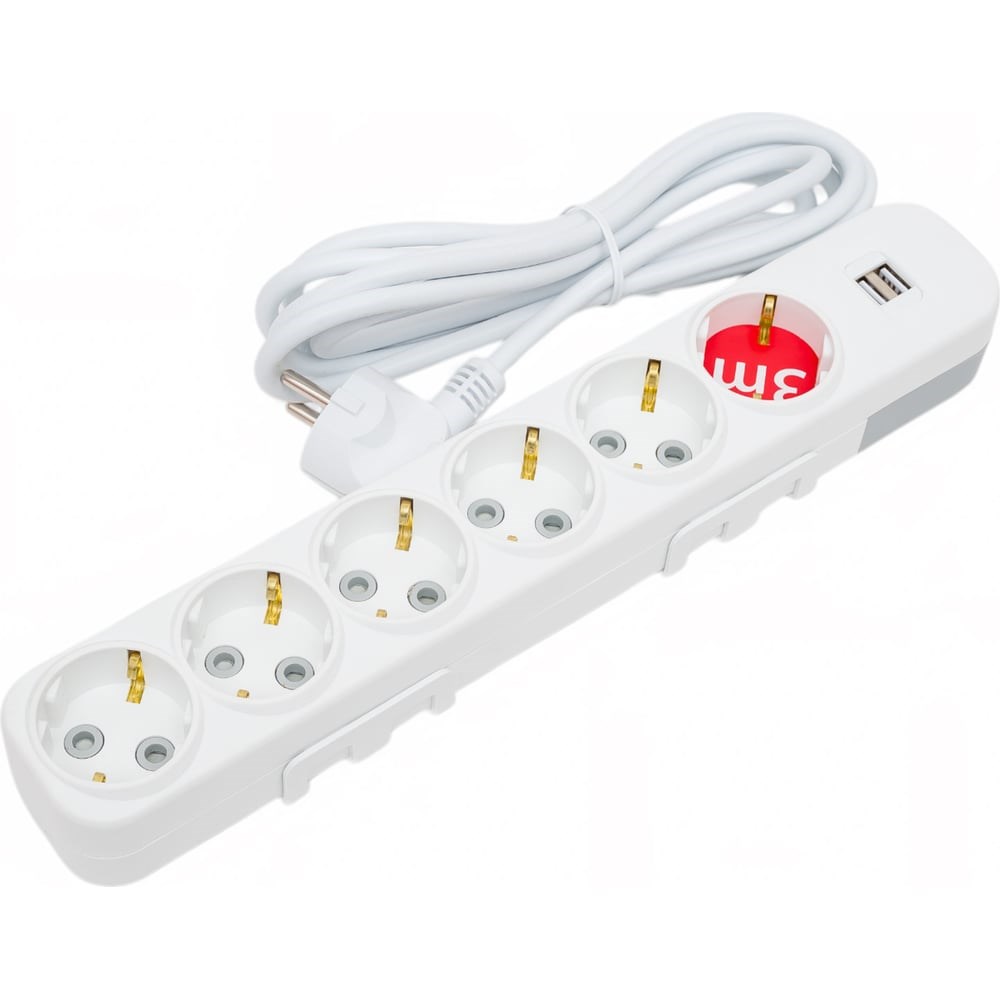 Удлинитель ELBI Myra с заземлением, 6 гнезд, с защитными шторками, USB, 3м, 3x1 527-040203-611