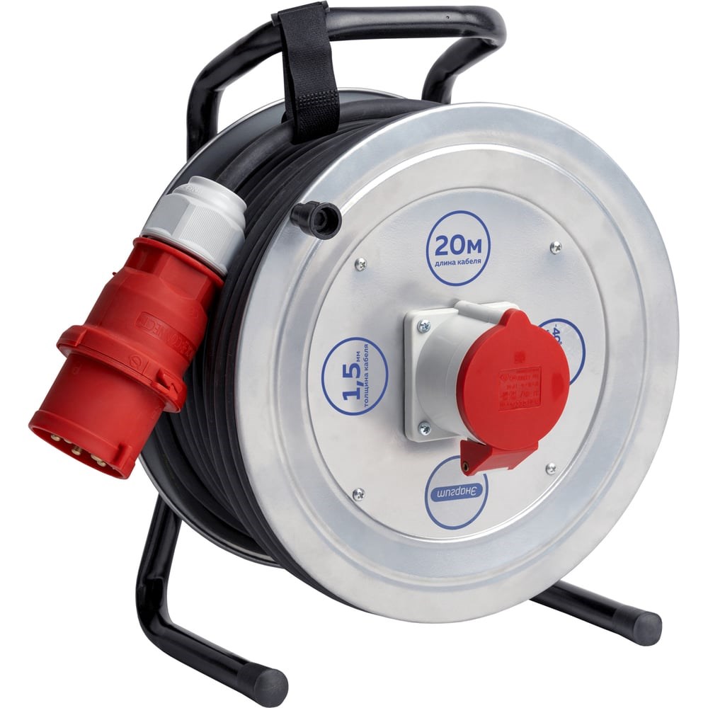 Удлинитель на катушке ЭНАРГИТ 380 Вольт, КГ 4х1,5 ГОСТ, 20 метров, МК1-415-20К-3801-44 имеет крепкий металлический корпус, который покрыт электроизоляционным (диэлектрическим) антикоррозийным порошковым покрытием. Промышленные силовые разъемы от ведущих мировых производителей гарантирующие безопасность и надежность. Силовые разъемы изготовлены из "полиамид 6" (термопласт). Он отличается высокой твердостью, прочностью, поэтому используется для производства деталей, испытывающих высокие ударные нагрузки. Прочность деталей из "полиамида 6" почти не уступает металлическим. Материал прекрасно переносит высокие температуры. Латунные контакты менее подвержены коррозии и уменьшают потери за счет лучшей проводимости. Кабель отличается стойкостью к многократным изгибам и воздействию отрицательных температур, изготовлен по стандарту ГОСТ. Номинал установленных силовых разъемов - 16 ампер, 4-ех контактные, обращайте внимание на эти параметры для совместимости с Вашими силовыми разъемами в сети.