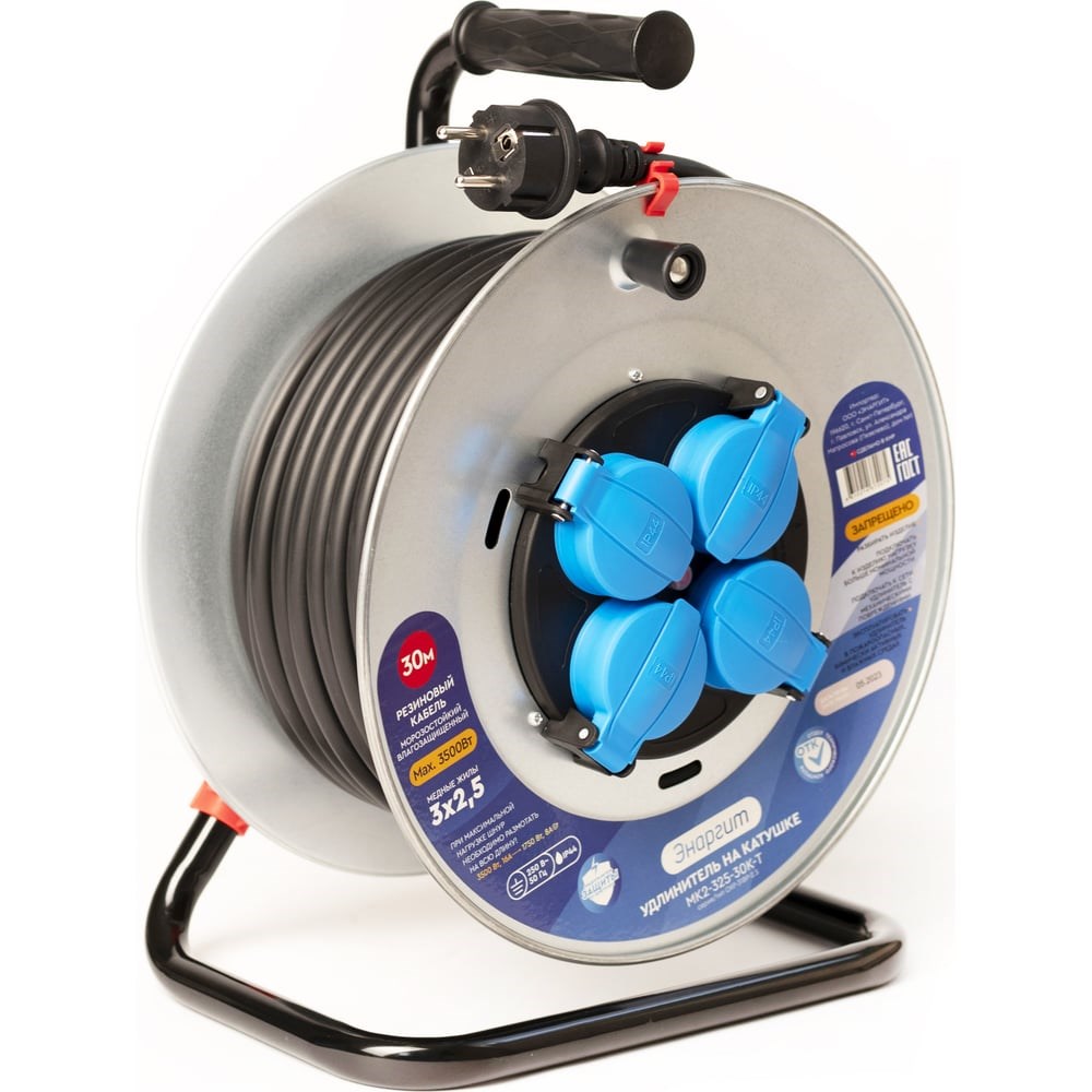 Удлинитель на металлической катушке энаргит МК2: кг 3x2,5 (40 метров, ip 44, с термодатчиком) арт. МК2-325-40К-Т подойдет для использования на строительных, производственных и судостроительных площадках, а также в быту. Кабель выполнен по стандарту ГОСТ.Крепкая рама выполнена из мет. трубы диаметром 22,5 мм, что гарантирует прочность и устойчивость конструкции. Корпус катушки имеет антикоррозийное порошковое покрытие.Вилка из каучука обладает хорошим электроизоляционными свойствами, высокой износостойкостью и степенью защиты IP44 (защита от пыли и брызг). Латунные контакты менее подвержены коррозии и уменьшают потери за счет лучшей проводимости.Вставка блока розеток имеет четыре гнезда с заземляющими контактами. Гнезда розеток закрыты резиновыми заглушками от попадания воды, пыли, грязи. Изолирующие детали и несущие токоведущие части вилки выполнены из термостойких и влагостойких материалов, что дает возможность использовать удлинитель в неблагоприятных условиях. Жилы сетевого провода обжаты латунными наконечниками, что обеспечивает достаточную площадь контакта и уменьшает отгорание токоведущих нитей.Кабель отличается стойкостью к многократным изгибам и воздействию отрицательных температур. Сечение провода 2,5мм. предоставляет широкий диапазон для подключении электроприборов и инструментов высокой мощности.Установленный автоматический выключатель на 16А предохраняет силовой удлинитель от повышения нагрузки большей мощности, что предотвращает возгорание провода.