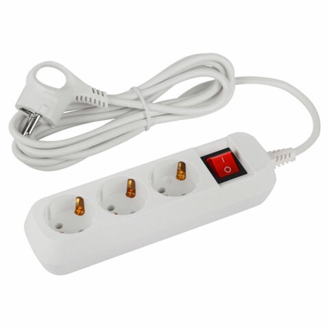 Сетевой удлинитель в пластиковом корпусе оснащен 3 розетками с заземлением. Корпус выполнен из негорючего пластика. На корпусе расположен выключатель. Толщина жил кабеля – 3x0,75 мм, длина кабеля – 3 м, номинальное напряжение – 220 Вт, максимальный ток нагрузки – 10 А, суммарная мощность нагрузки – 2200 Вт.