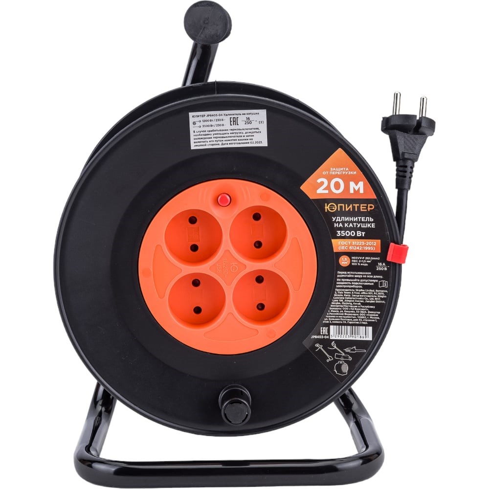 Удлинитель на катушке ЮПИТЕР 20 м 4 розетки 3,5кВт JP8403-04 служит для подключения электроприборов вдали от стационарной розетки в бытовых условиях эксплуатации. Предназначен для использования в электрической сети 230В, для питания устройств с максимальной суммарной мощностью нагрузки 3,5 кВт. Корпус изготовлен из огнестойкого пластика, оснащен удобной рукояткой для транспортировки. На катушке есть термовыключатель, который защитит удлинитель от повреждений в результате превышения допустимой нагрузки.
