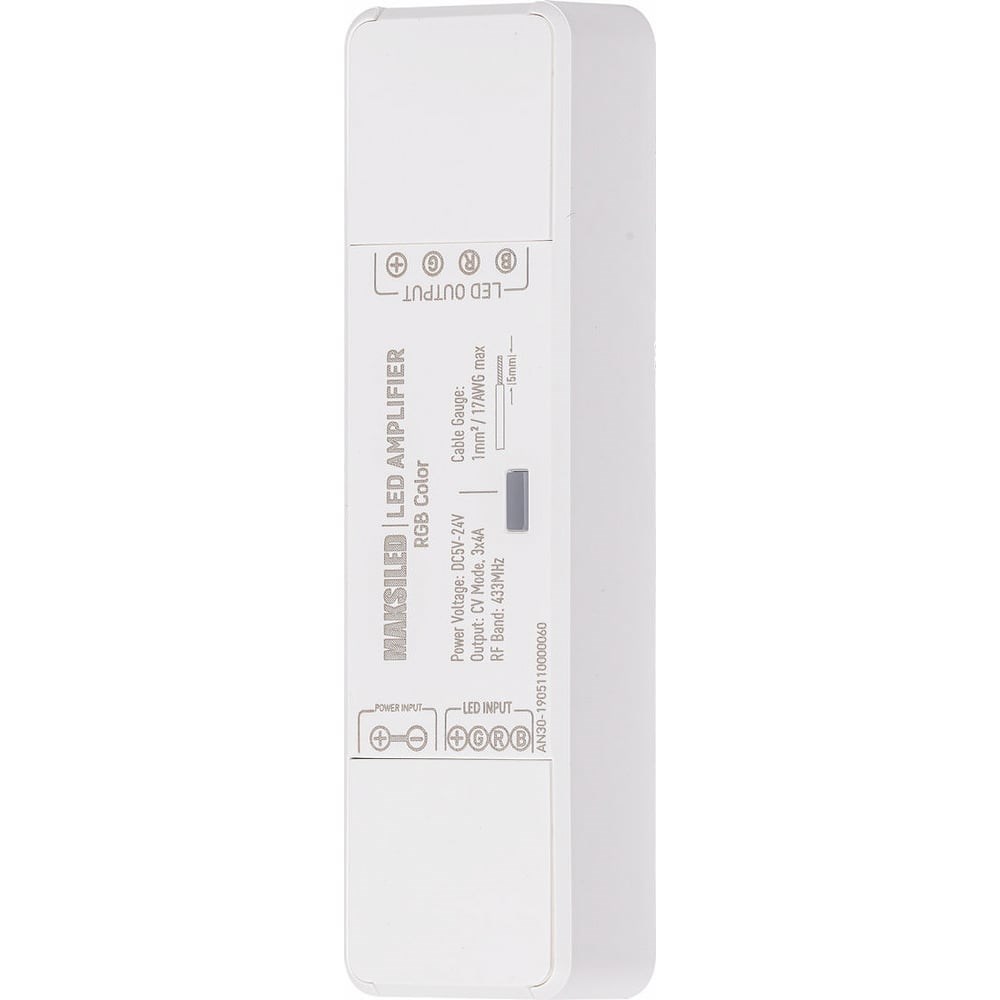 Усилитель MAKSILED RGB 5-24В, 60/144/288Вт, 3x4А, IP20, 87x24x15мм ML-RP-AN30 предназначен для усиления сигнала управления светодиодными устройствами с постоянным напряжением и светодиодами с постоянным управляющим напряжением, имеющими общий анод, которые работают при напряжении питания в диапазоне 5-24 В Усилитель имеет вход питания, сигнальный вход и выход для светодиодов, а также зажим для кабеля. В усилителе предусмотрена защита от перегрузки, короткого замыкания, перегрева и неправильного подключения. Разноцветный индикатор, расположенный в верхней части, позволяет определить рабочее состояние усилителя.