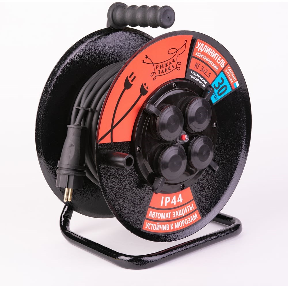 Удлинитель Рыжая такса УКМ-44 (катушка металл) с автоматом защиты, провод КГ-ХЛ 3x2,5 (16А), 4гнезда, 30м, IP44 УКМ4404-3438