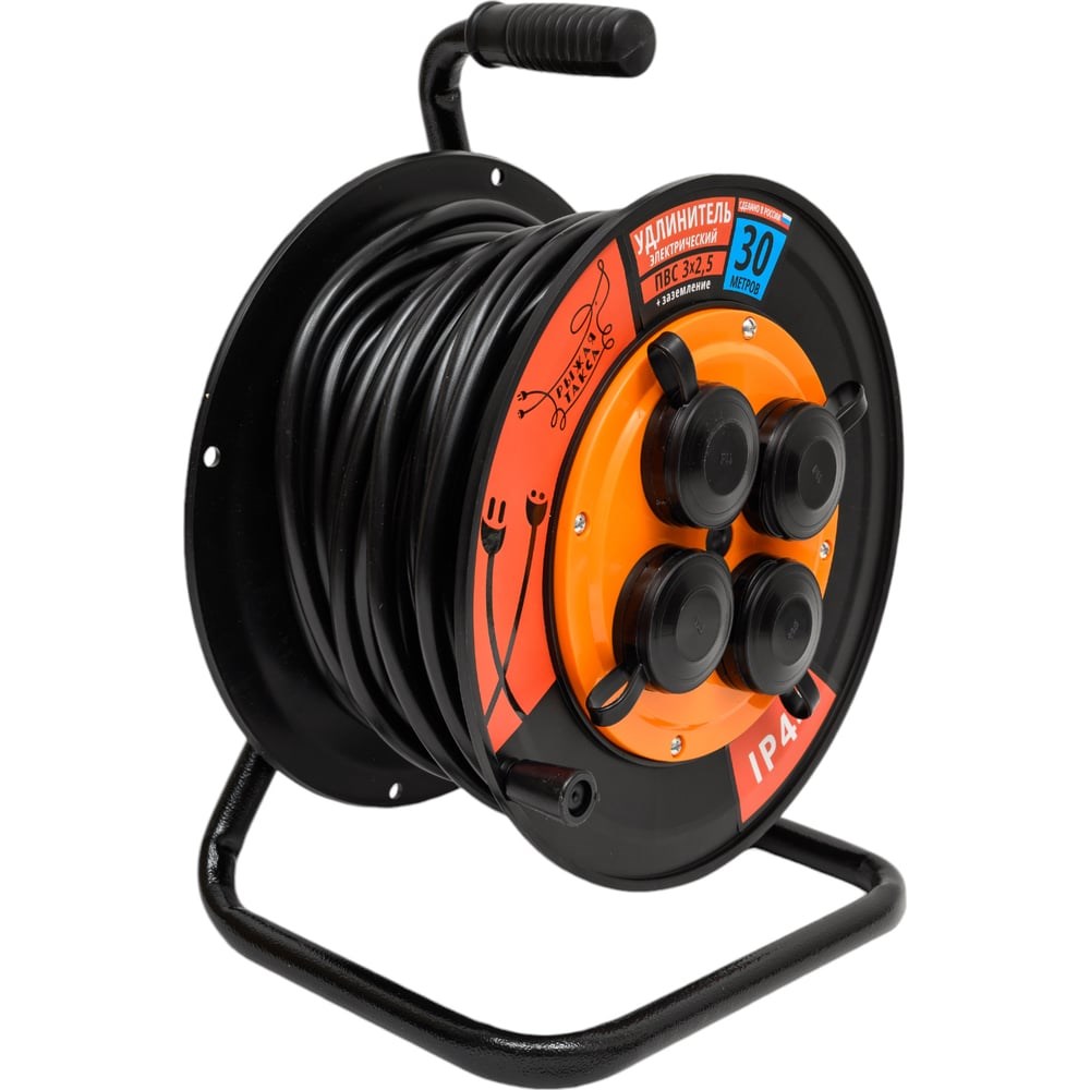 Удлинитель Рыжая такса УКП-44 (катушка пластик) ПВС, 3х2,5 (16А), 4гнезда, 30м, IP44, с заземлением, УКП4404-3056