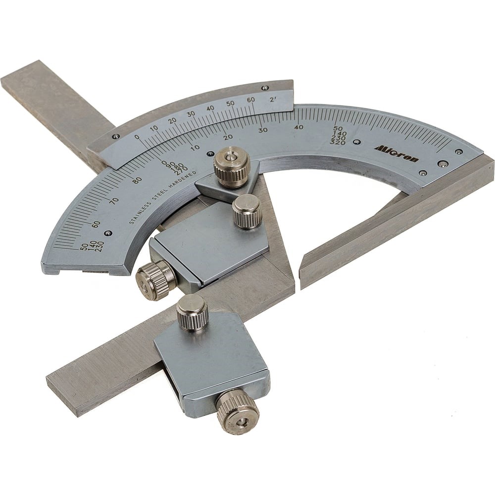 Угломер с нониусом Micron 0-320 МИК 25463 используется для измерения наружных и внутренних углов. Настройка для различных диапазонов производится путем комбинации отдельных измерительных звеньев. Прибор выполнен из нержавеющей стали, что обеспечивает высокую прочность и долгий срок службы.