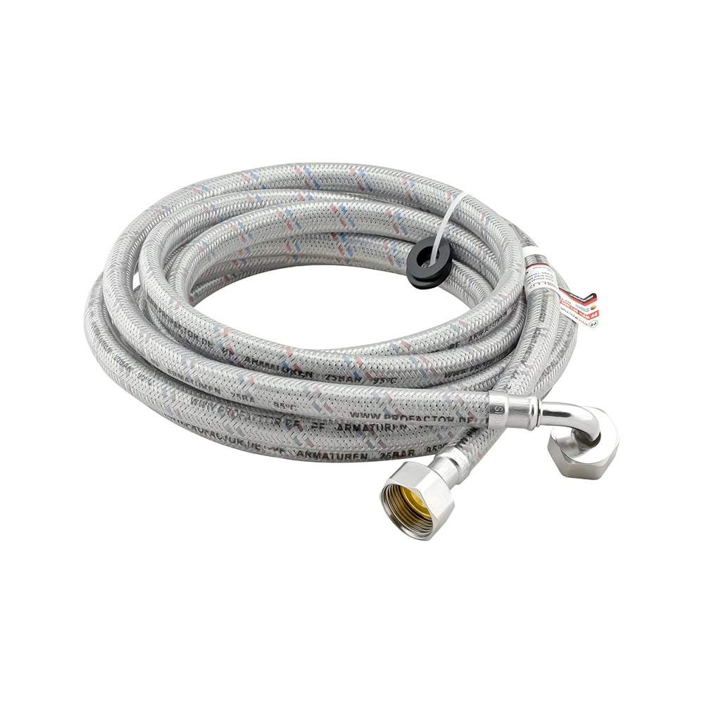 Гибкая подводка с угловым присоединением PROFACTOR® LUXE для стиральных машин применяется для подведения воды к агрегатам бытового назначения (водонагревательным приборам, стиральным и посудомоечным машинам, и т.д.). Подводка имеет угловое присоединение — что является лучшим решением при подключении сантехнических приборов в условиях ограниченного пространства. Внешнее расстояние присоединенной подводки до плоскости стены всего 37мм. Мощные гайки из нержавеющей стали AISI 201 гарантируют надежность в зоне присоединения при ее монтаже и эксплуатации. Термостойкое полимерное покрытие осуществляет защиту от негативных воздействий внешней среды, продлевая срок службы изделия, препятствует образованию конденсата, способствует поддержанию пространства для инженерных коммуникаций в чистом и сухом состоянии. Внутренний шланг выполнен из экологически чистого материала EPDM, что даёт возможность использования данной подводки для питьевой воды Материал фитингов и оплетки шланга: нержавеющая сталь Наружный диаметр подводки: 14,4мм Прочность на разрыв: 80 — 130 бар Минимальный радиус изгиба шланга при монтаже: 75мм Пропускная способность: 33 л/мин при давлении 3 кг/см² Рекомендуемое усилие при затяжке гайки: до 4 Н/м