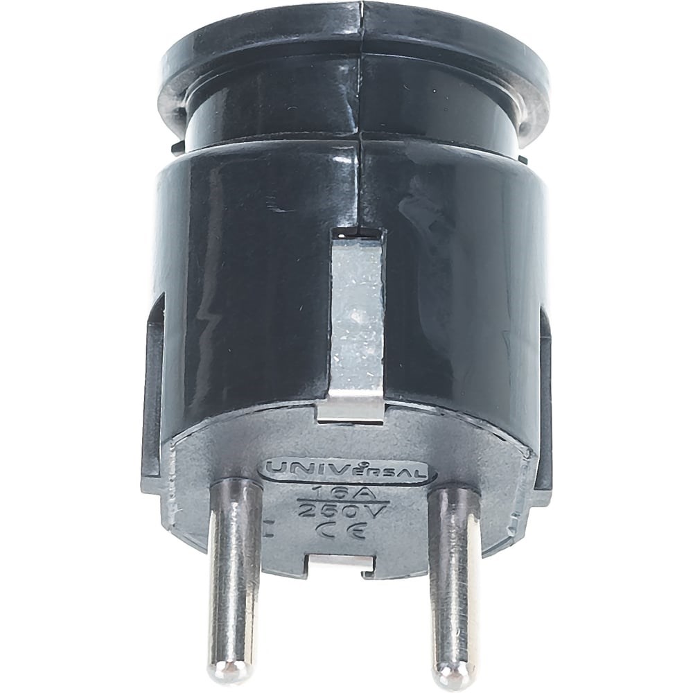 Угловая вилка с заземлением, черная 16А 250В UNIVersal А0105 - электротехнический элемент для сбора удлинителя или ремонта любого бытового электроприбора. Угловая конструкция очень удобна в применении, особенно при подключении к стационарной розетке в местах с ограниченным пространством.