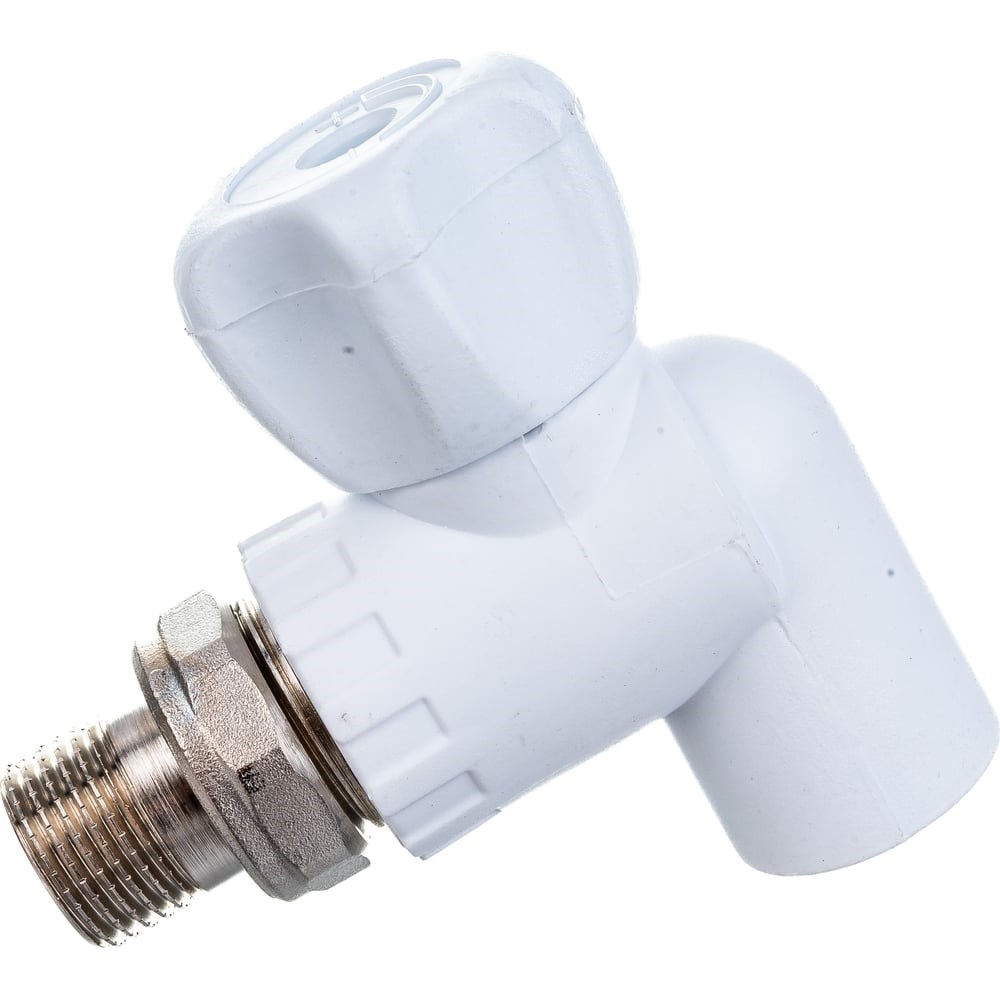 Кран полипропиленовый шаровой с американкой (сгоном) для радиатора угловой 20х1/2" наружная резьба КРОСС служит для перекрытия потока через отопительный прибор в системах отопления и водоснабжения (ХВС и ГВС), смонтированных из полипропиленовых труб. Монтирование крана производится с помощью полусгона, закрепленного на закладной детали накидной гайкой. # радиаторный угловой