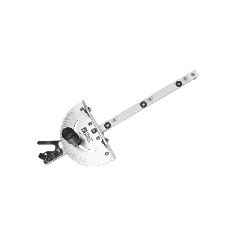 Угловой упор с транспортиром для пиления и фрезерования с шагом 5° и фиксированным углом 22,5° подходит для использования на фрезерных столах, циркулярных и ленточных пилах, а также на шлифовальных станках. Угловой упор применяется при обработке заготовок и имеет 27 фиксированных положений. Изделие состоит из упора, к которому прижимается заготовка, и транспортира-полукруга, жёстко связанного с упором и фиксируемого под определённым углом от -90ºдо +90ºк направляющей планке. Фиксируемые положения с шагом угла через 5º и 22,5°Алюминиевый ползун для паза 19 мм с 4-мя парами пластиковых колец-втулок для регулировки люфта