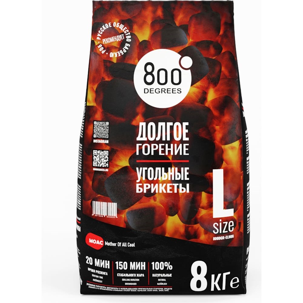 Брикеты угольные 800 Degrees Extra Long Heat в многослойных, плотных бумажных мешках производятся по уникальной технологии из высококачественного древесного угля лиственных пород деревьев. Вся продукция рекомендована для приготовления пищи Русским Обществом Барбекю (РОБ) к применению во всех типах угольных и дровяных грилей, хосперах, а также в мангалах, печах и очагах.Брикеты и кусковой уголь 800 Degrees наилучшим образом подходят для грилей и смокеров Weber, Napoleon, Char-Broil, Broil King, Carbo, Big Green Egg, Kamado Joe, Monolith, Oklahoma Joe’s, Grillvett, Firemagic и других производителей и типов. При розжиге в печах, грилях и хосперах, при необходимости рекомендуем разбавлять с кусковым углем Lump Charcoal для понижения жара. Для быстрого розжига используйте оригинальные брикеты и роллы для розжига, а также стартер Chimney Starter XL из нержавеющей стали с ручкой из натурального Зебрано.Продукция сертифицирована и производится из отходов лесопереработки, а также засохших деревьев из Карелии, Алтая и Сибири. Производство древесного угля 800 Degrees не наносит ущерба экологии, а готовая продукция отличается от аналогов низкой зольностью, высокой теплоотдачей, отсутствием запаха и длительным ровным горением. Брикеты отлично подходят для копчения и режимов low-n-slow.Серия Extra Long Heat Briquettes имеет следующие показатели и характеристики:15 мин время розжига180 мин стабильного жара100% натуральный и чистый продуктСостав: древесный уголь лиственных пород деревьев.