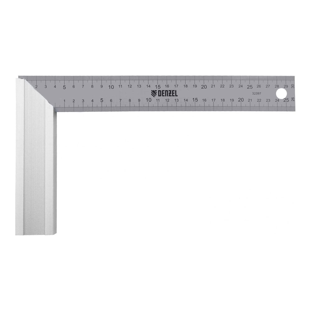 Стальной угольник Denzel 32397 длиной 300 мм, с градуировкой, алюминиевым основанием и полотном из нержавеющей стали, используется для построения и контроля углов. Будет полезен для выполнения столярных и строительных работ.