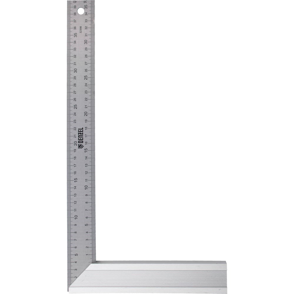 Стальной угольник Denzel 32398 длиной 400 мм, с градуировкой, алюминиевым основанием и полотном из нержавеющей стали, используется для построения и контроля углов. Будет полезен для выполнения столярных и строительных работ.