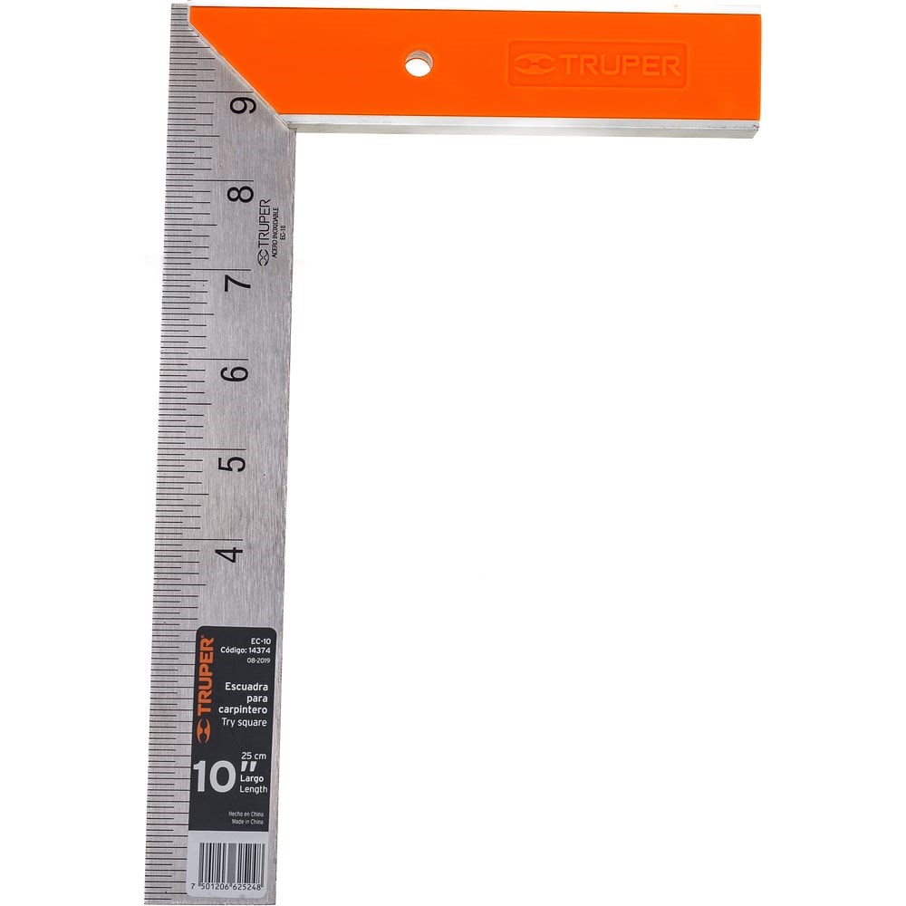 Измерительный угольник столяра Truper EC-10 14374 прослужит не один год, так как полотно изготовлено из нержавеющей стали, а ручка из алюминия. Предназначен для контроля прямоугольных заготовок, также используется для разметки и проведения измерений. Длина инструмента - 250 мм.