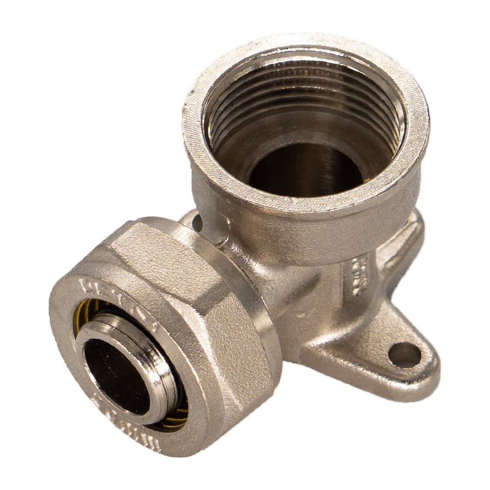 Уголок с креплением 20х3/4 CTM - обжимной фитинг для соединения металлопластиковых (металлополимерных) труб. Изготовлен методом горячей штамповки из латуни с последующей термической обработкой и никелированием для предотвращения появления коррозии, механического износа и вредного воздействия агрессивных жидкостей и воздушно-газовых сред. Корпус, накидные гайки и обжимные кольца уголка изготовлены из латуни , уплотнительное кольцо из нетоксичной резины (EPDM), диэлектрическая прокладка из фторопласта Ф4. Накидные гайки – усиленные. Материал: латунь с никелированным покрытием Соединение: цанга/внутренняя резьба Давление: 16 бар Рабочая температура: от -20°С до +115°С