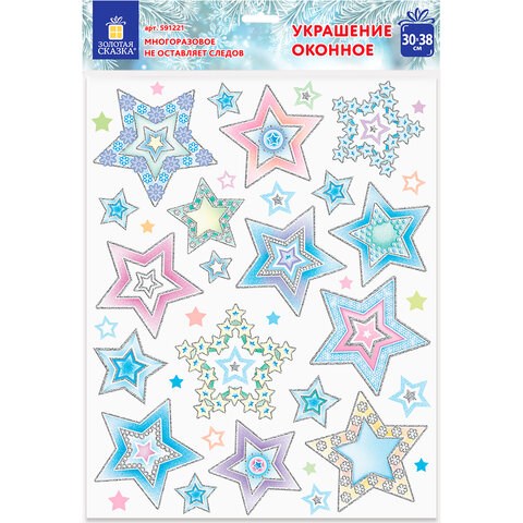 Изделие с изображением цветных звезд и снежинок представляет собой наклейку на окно/стекло, изготовленную из поливинилхлорида (ПВХ). Наклейка размером 30x38 см декорирована серебристым глиттером. Украшение предназначено для декорирования окон, зеркал, стекол и других ламинированных глянцевых поверхностей. Не оставляет клеевых следов и предназначено для многократного использования. Крепится к поверхности посредством статического эффекта. Украшение на белой картонной подложке упаковано в прозрачный полипропиленовый пакет на картонном подвесе.
