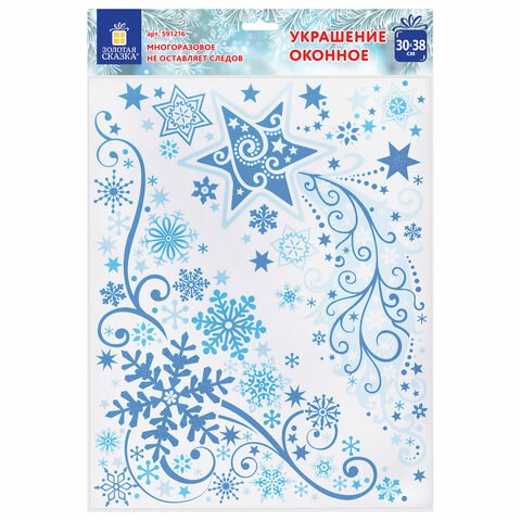 Изделие с зимним тематическим изображением представляет собой наклейку на окно/стекло, изготовленную из поливинилхлорида (ПВХ). Наклейка размером 30x38 см декорирована голубым и белым глиттером. Украшение предназначено для декорирования окон, зеркал, стекол и других ламинированных глянцевых поверхностей. Не оставляет клеевых следов и предназначено для многократного использования. Крепится к поверхности посредством статического эффекта. Украшение на белой картонной подложке упаковано в прозрачный полипропиленовый пакет на картонном подвесе.