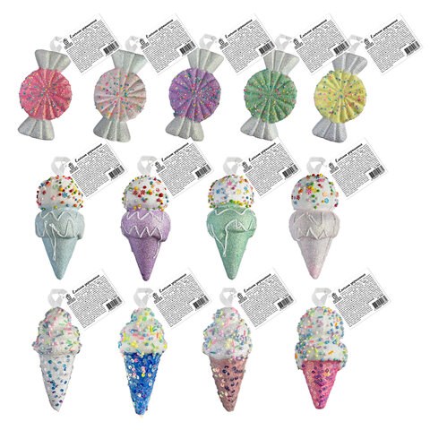 Изысканные игрушки в виде сладостей с покрытием из блесток – изящное украшение вашей ели. Мороженое, конфеты, пончики и кексики разного дизайна - каждая игрушка влюбляет в себя с первого взгляда! Изготовленные из пенопласта, легкие и ударопрочные - идеальны в дом, где есть дети и животные! Эти восхитительные игрушки придадут вашей ёлке неповторимость и очарование. Они легко крепятся к ветвям за подвязочные веревочки.