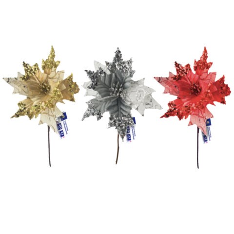 Поставляется в 3 цветах (без возможности выбора): золотистый, серебристый, красный. Диаметр украшения – 22 см, длина - 20 см. Материал – пластик, полиэстер, металл. Каждый цветок с цветной бумажной этикеткой.