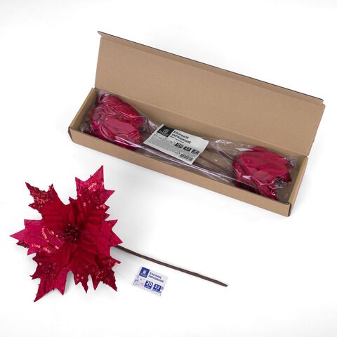 В комплекте 3 цветка. Поставляются в 1 цвете: красный. Диаметр украшения – 22 см, длина – 20 см. Материал – пластик, полиэстер, металл. Упакованы в картонную коробку.