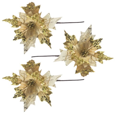 В комплекте 3 цветка. Поставляются в 1 цвете: золотистый. Диаметр украшения – 22 см, длина - 20 см. Материал – пластик, полиэстер, металл. Упакованы в картонную коробку.