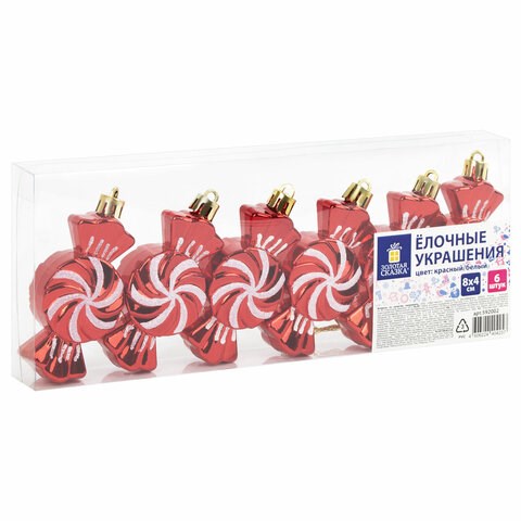 Украшение ёлочное "Конфетки", 6 шт., 8х4 см, пластик, цвет: красный/белый, ЗОЛОТАЯ СКАЗКА, 592002