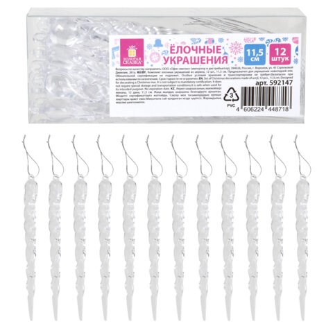 В наборе 12 сосулек. Размер украшений - 11,5 см. Материал - акрил. Упакованы в прозрачную коробку из ПВХ.