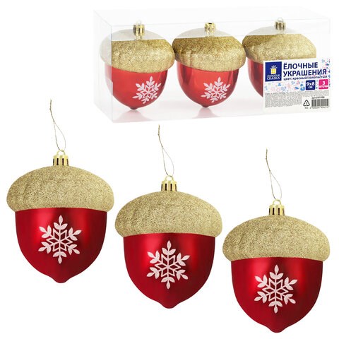 3 декоративных украшения в форме жёлудя размером 9x8 см красного и золотистого цветов с глянцевым эффектом и белым рисунком; нитки из полиэстера длиной 30 см для подвешивания шаров золотистого цвета (3 шт.).