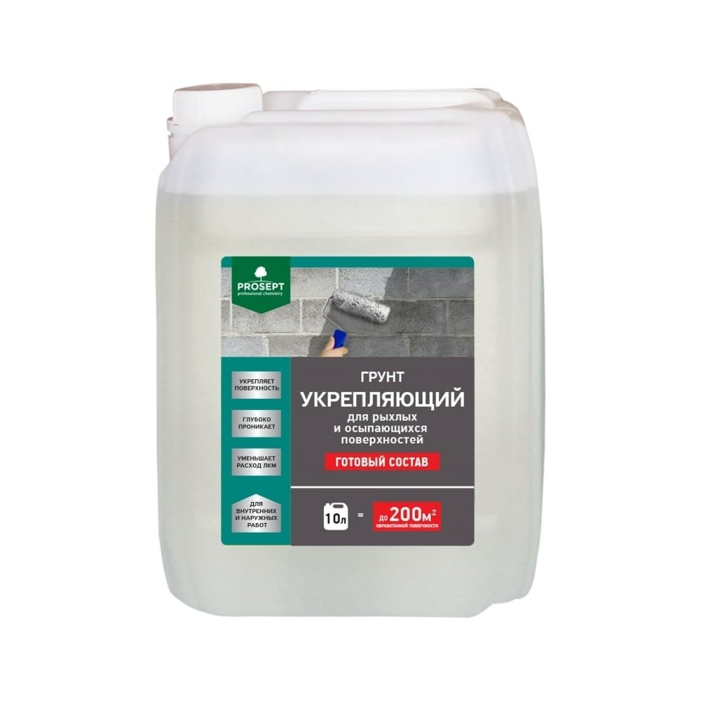 Укрепляющий грунт PROSEPT для рыхлых и осыпающихся поверхностей, готовый состав, 10 л 049-10 снижает и выравнивает впитывающую способность поверхностей, образуя паропроницаемое покрытие. Глубоко проникает, укрепляет пористые поверхности, улучшает сцепление отделочных материалов. Быстро сохнет и существенно сокращает расход финишных материалов.Грунт предназначен для нанесения на пористые неравномерно впитывающие рыхлые и старые основания - гипсокартон, газобетон, гипс, бетон, керамический и силикатный кирпич, камень, штукатурка, шпатлеванные поверхности ДСП, фанера.Нанесение грунта является этапом перед водно-дисперсионными красками, оклейкой обоями, шпатлеванием и облицовкой керамической плиткой.Применяется для внутренних работ в помещениях с нормальной влажностью - спальни, гостиные, детские комнаты, офисы, а также для наружных работ под навесом.Работы проводить при температуре не ниже +5°С и не выше +35°С.Тщательно перемешать раствор. Нанести грунт на сухую поверхность равномерно и обильно в 1 слой. Для сильно впитывающих оснований рекомендуется нанесение в 2 слоя без промежуточной сушки до полного насыщения поверхности. Защитить от попадания влаги до момента полного высыхания, после чего можно продолжать отделочные работы.Время высыхания: при температуре +20 °C и относительной влажности 65 % в зависимости от толщины покрытия и поверхности нанесения 1-3 часа.Расход рабочего раствора: 50 - 200 г/м2 в зависимости от типа поверхности и количества наносимых слоев.